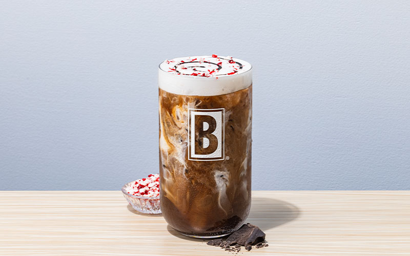 Smooth Cold Brew with rich chocolate and cool peppermint flavors, finished with a layer of sweet foam and peppermint candies for a refreshing holiday twist.