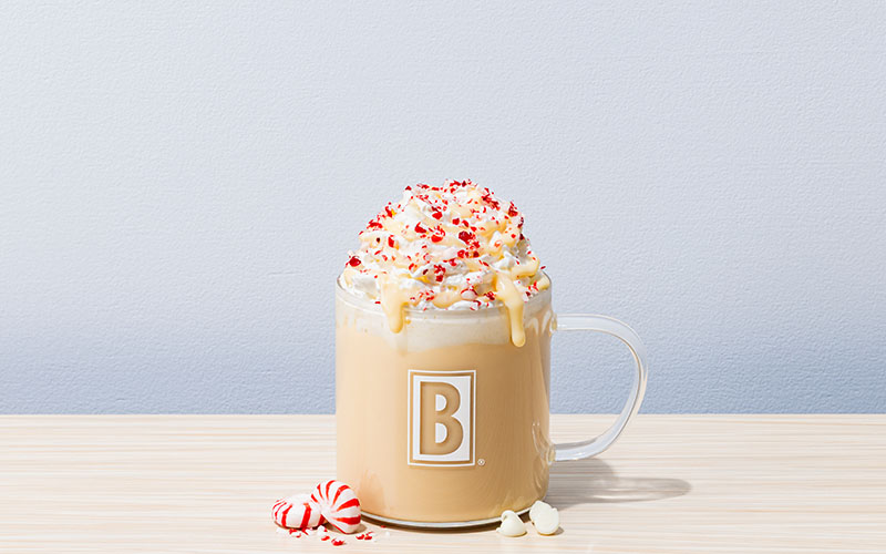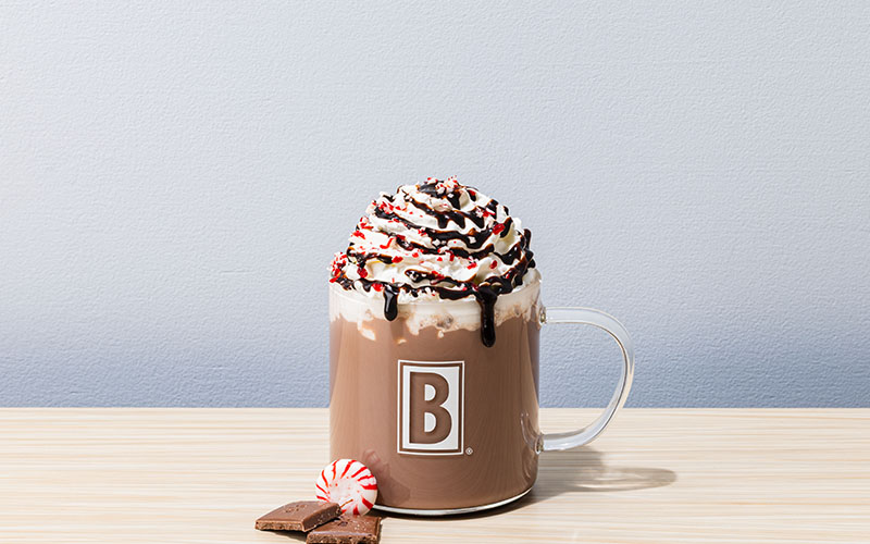 A holiday classic blend of hot chocolate and cool peppermint topped with dreamy whipped cream and a peppermint crunch.