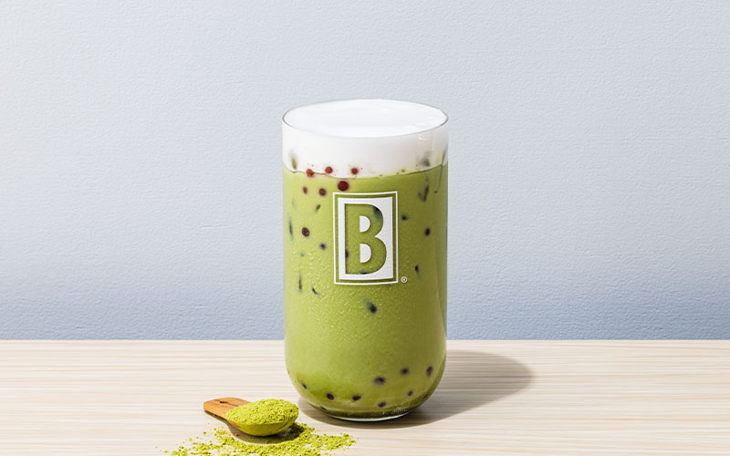 A vibrant matcha latte adorned with strawberry boba and fluffy sweet foam. It's a little mischievous and a lot delicious.