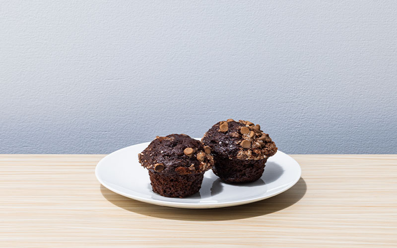 Two rich, fudgy mini muffins pack with chocolate chips. The perfect pairing for your holiday sips.