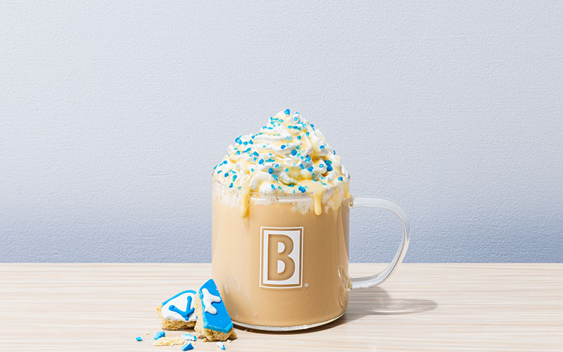 A buttery sugar cookie in a cup! Frosted Sugar cookie flavor topped with whipped cream and starry blue sugar sprinkles. Available hot, iced, or frozen.