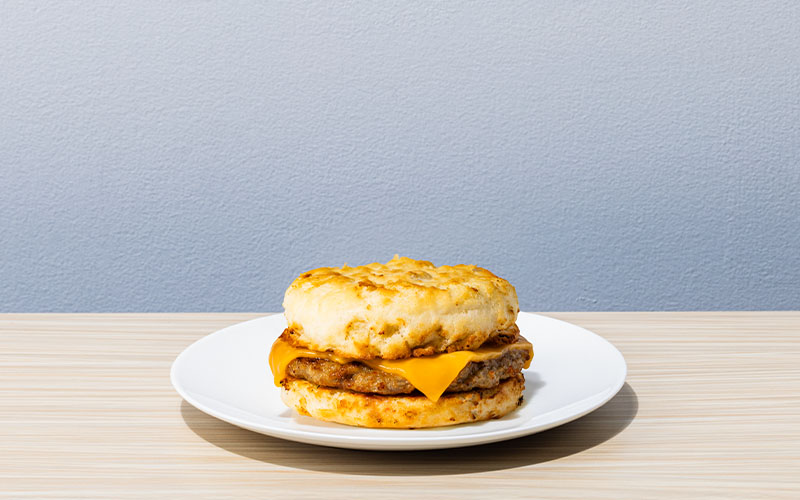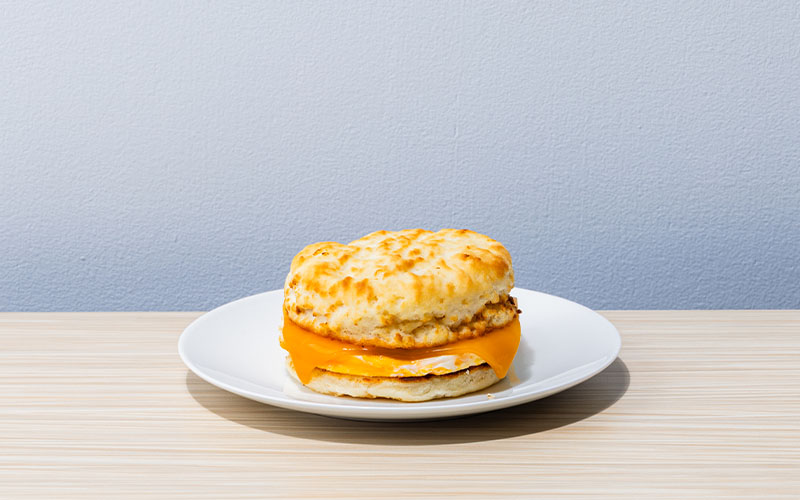 Savory sausage and melty cheddar on a warm biscuit, drizzled with honey.